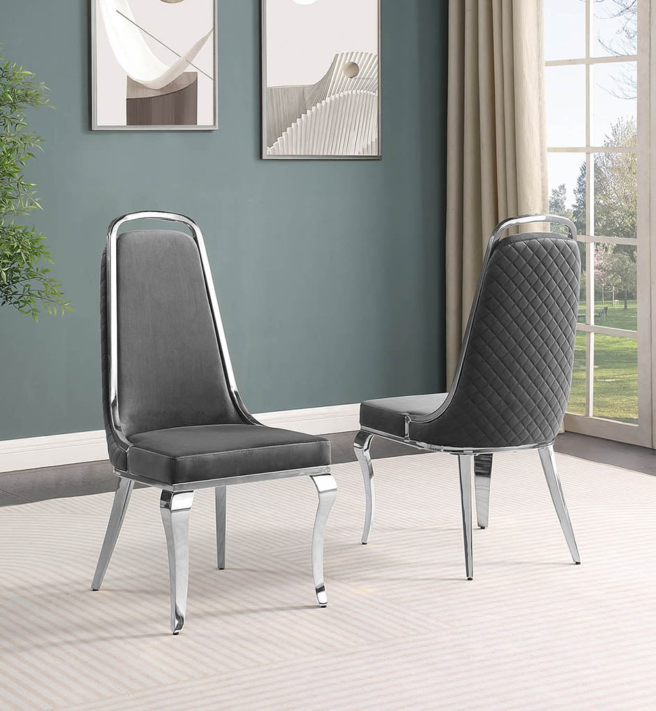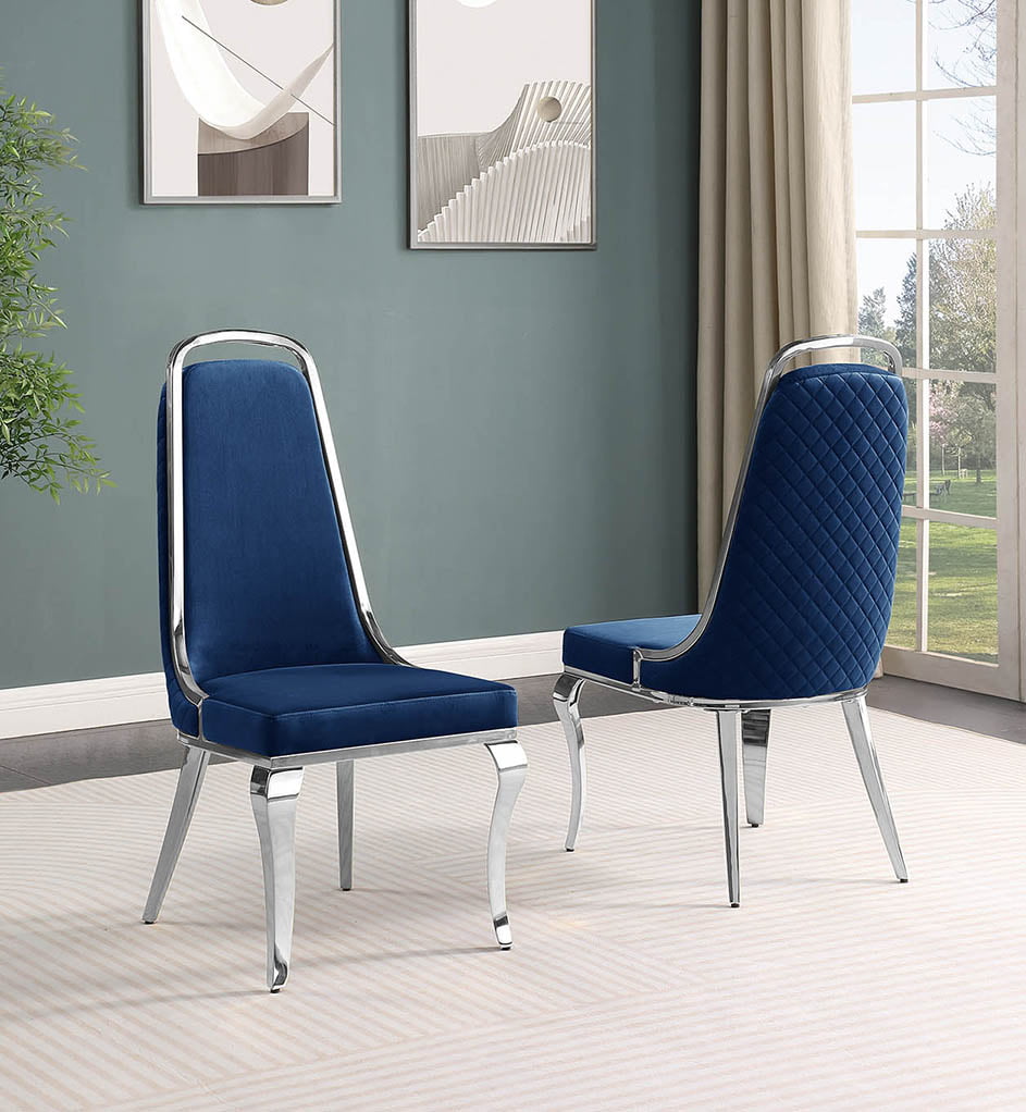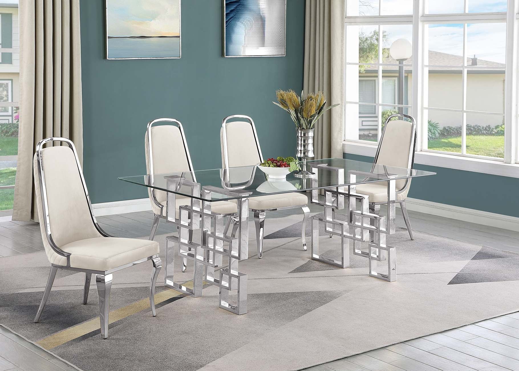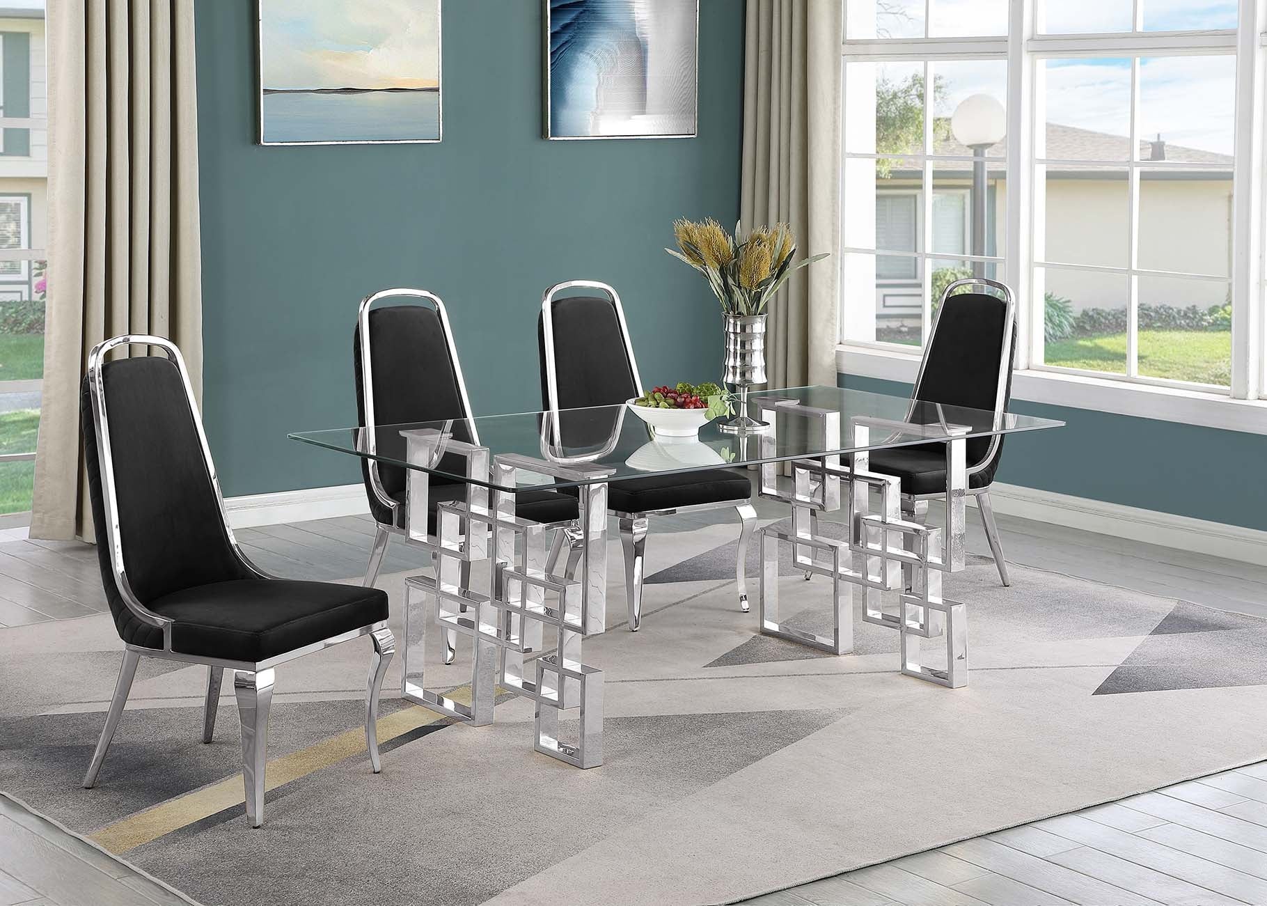Upgrade your dining experience with our exquisite dining set featuring a stunning 12mm clear tempered glass dining table, elegantly supported by a sleek stainless steel base. Accompanied by a set of stylish chrome chairs upholstered with velvet, this ensemble effortlessly combines modern aesthetics with supreme comfort. Chair colors are available in Dark Gray, Navy Blue, Black, and Cream.