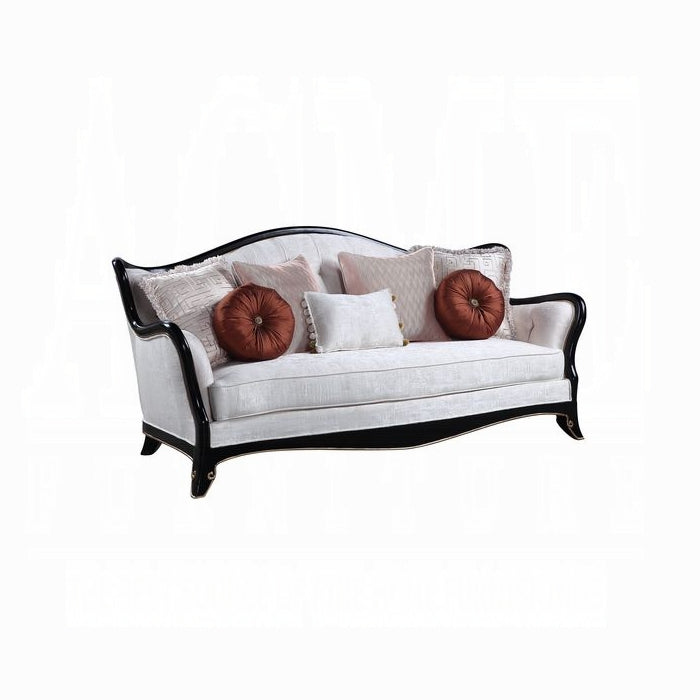 Popularized the Louis XV-era, cabriole style furniture creates a regal look, with its exposed wooden frame, and tight cushioning. This formal Nurmive collection adds a sense of provincial elegance in neutral beige upholstery. The backrests are enhanced with button tufting and the wooden frame is accentuated with gold trim. The included throw pillows are in bold and light hues to offset the pieces and bring them to life.