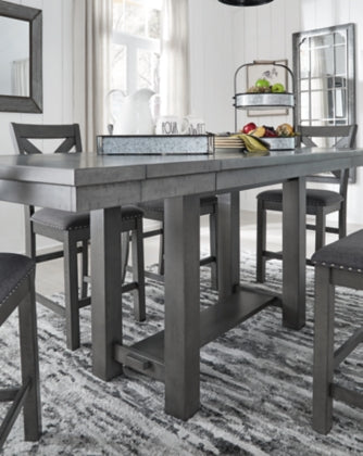 Going gray in the best possible way. This counter height dining table wows with an utterly on-trend smoky gray finish and plank styling. Easy-on extension leaves attach at either end of the table for family dinners or impromptu entertaining. Just a touch of distressing helps it fit right in with your modern farmhouse decor.