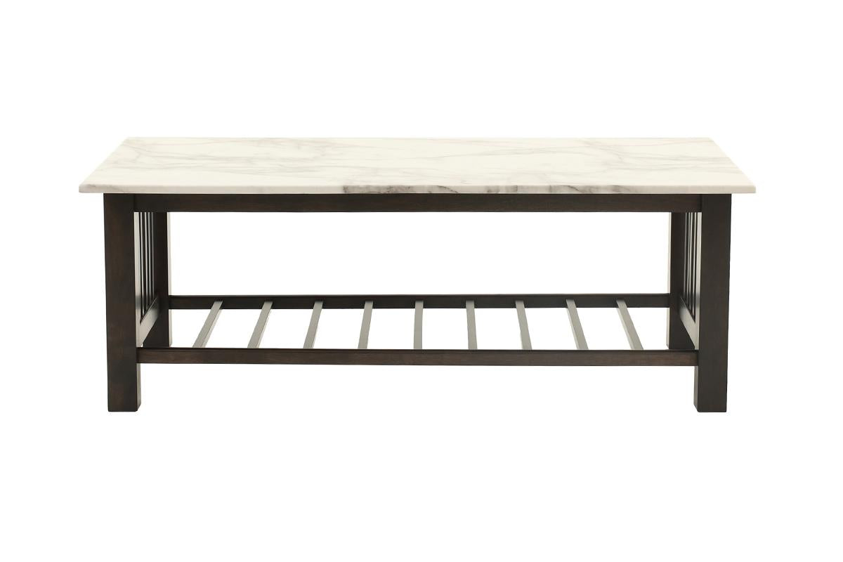Introduce this unique and beautiful furniture set that can complete a look for your home. Consists a console, coffee table, and a end table, every piece perfectly match with each other. With the faux marble top and dark color support legs, it can fit any beautiful plants pot or a design catalog on top. You can store your photo album or magazines at the bottom tier. With two tiers for all pieces, you can always rearrange and place new decorations to make your place look more unique and gorgeous.