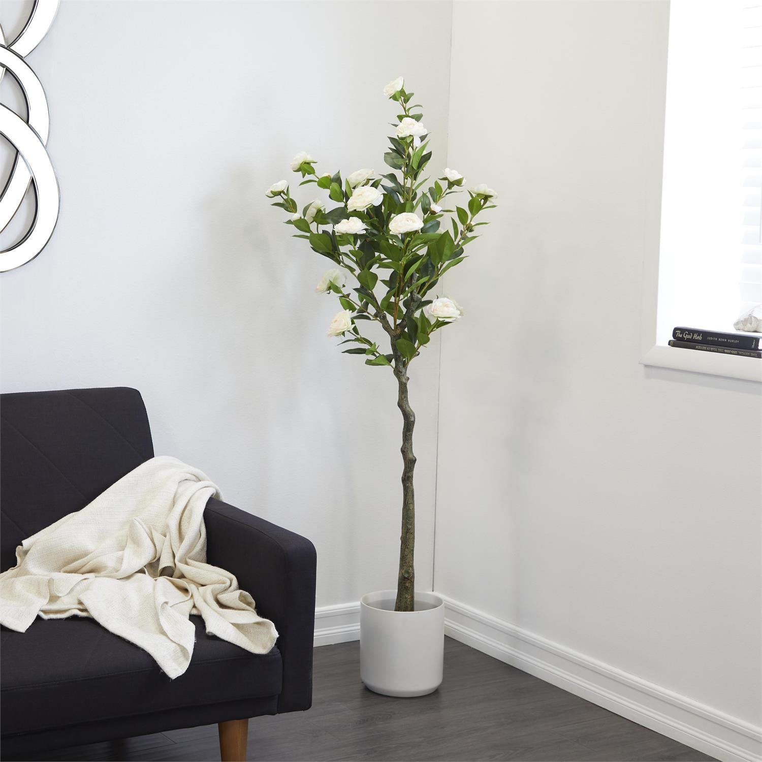 - Faux floor plant decor carries a fully bloomed camellia flowers with slender trunk and stems in a round pot
