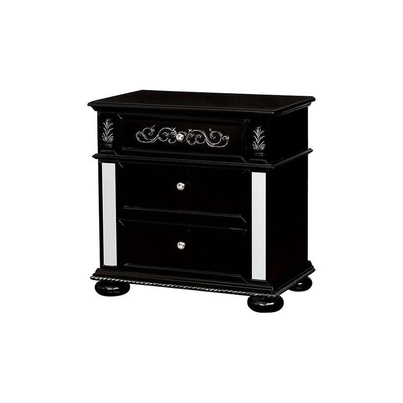 Lavishly update with this stunning bedroom set. The high back bed creates a glamorous focal point with its rounded finials, smooth arches and tufted details. The diamond-like button tufting adds more shine and plays with light in order to really elevate this bed's luminosity. Case goods shine as mirrored accents glimmer against the black finished set. Sculpted accents embellish with floral patterning, completing the set with rich styling.