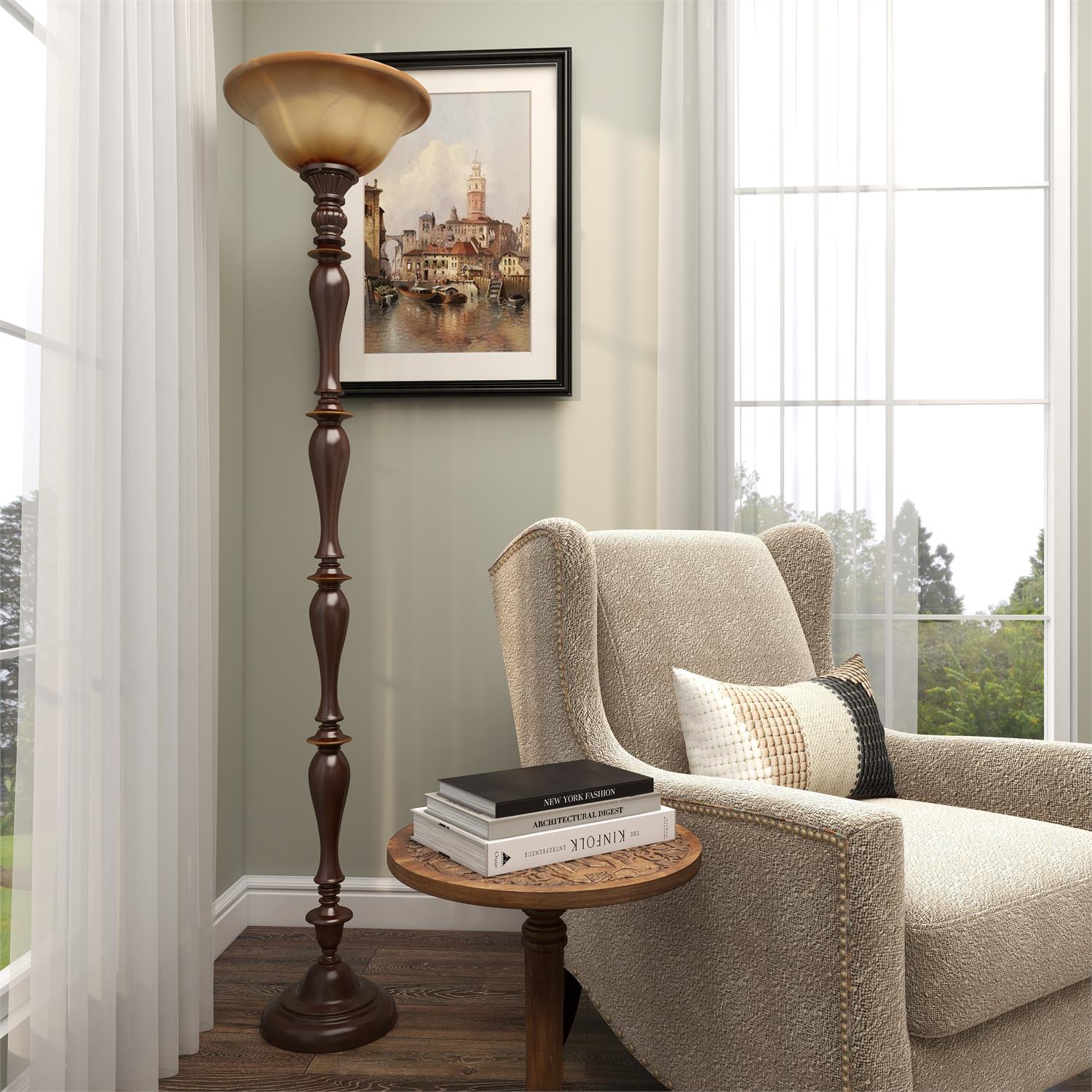 53674 Brown Polystone Antique Style Turned Torchiere with Cream Glass Shade, 16" x 16" x 72"