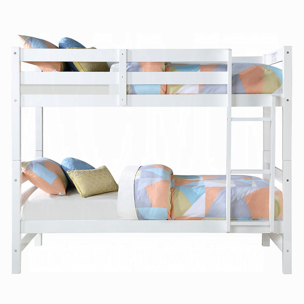 Give your children a space of their own with the Ronnie bunkbed. This unique twin over twin wooden bunk bed features full guardrails, a built-in rail ladder in a rich dark espresso or classic white finish. This artistically imagined bed is expertly designed to withstand the test of time and provide your little ones with enduring comfort and adventure.