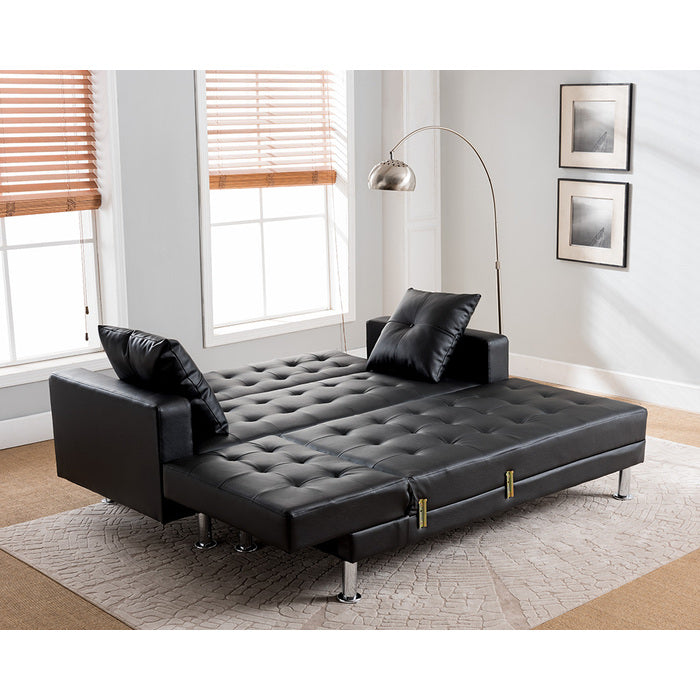 • Soft PU / Faux Leather Upholstered Click Clack Convertible Sofa Bed • Reversible Left or Right Chaise • Removeable Chaise to Front to convert Into Bigger Bed • Metal Chrome Cylinder Legs • 2 Throw Pillows Included • Easy to Assemble