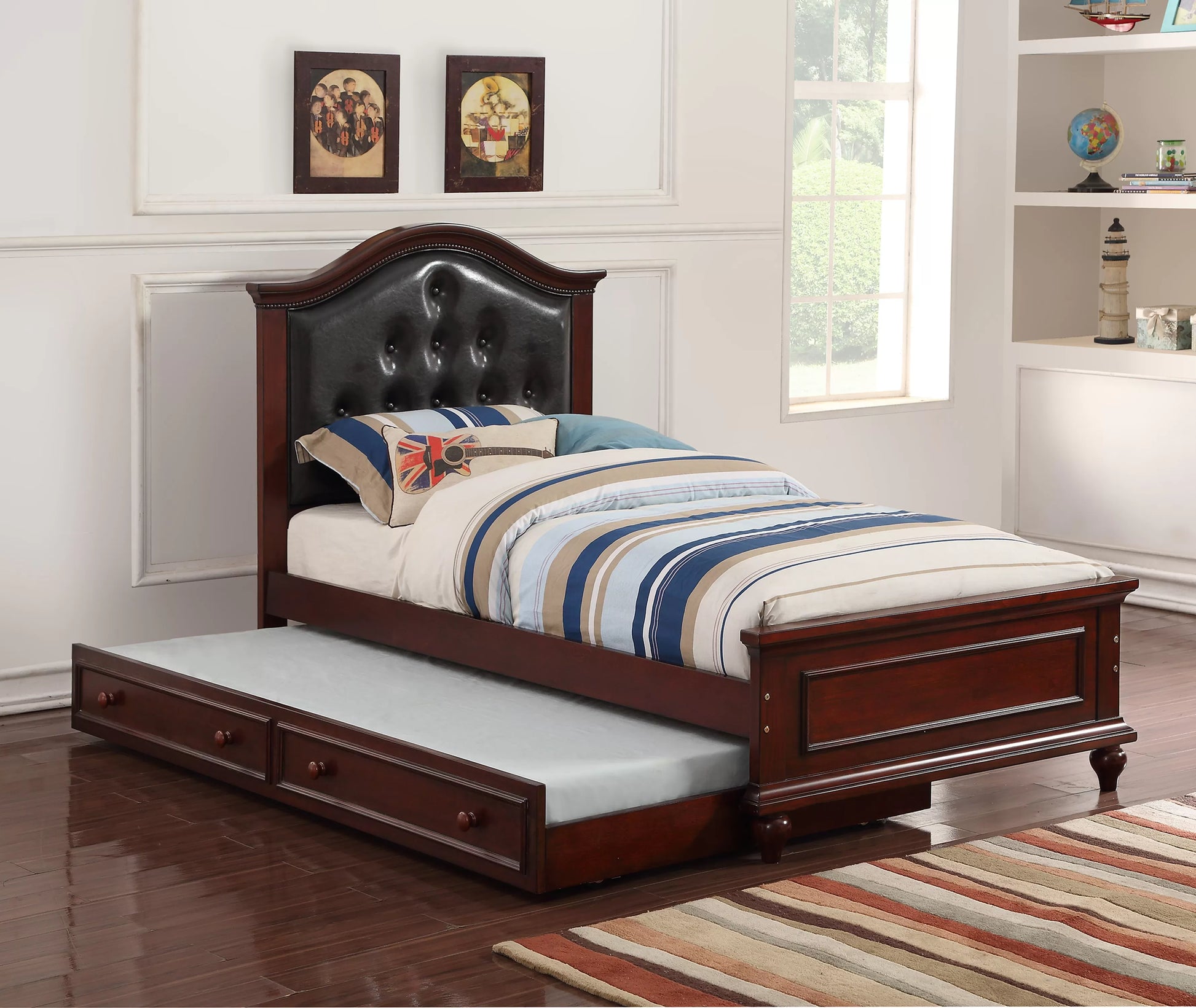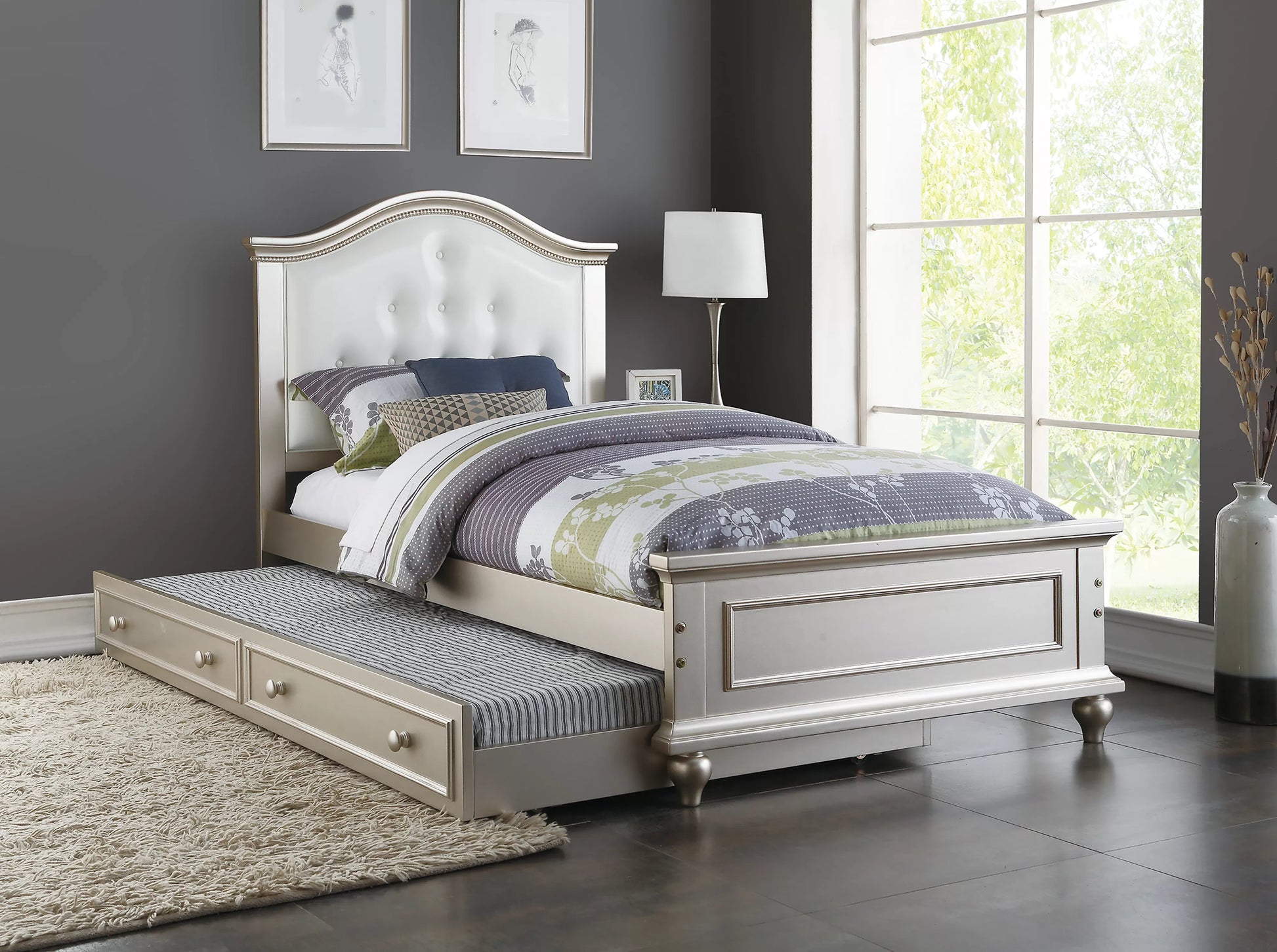 Inspire your teen or tween to dream with this lovely bed frame that features an upholstered headboard with accent button tufting. It also includes a lower trundle for a special friend. Available in pink/white, white or dark brown.