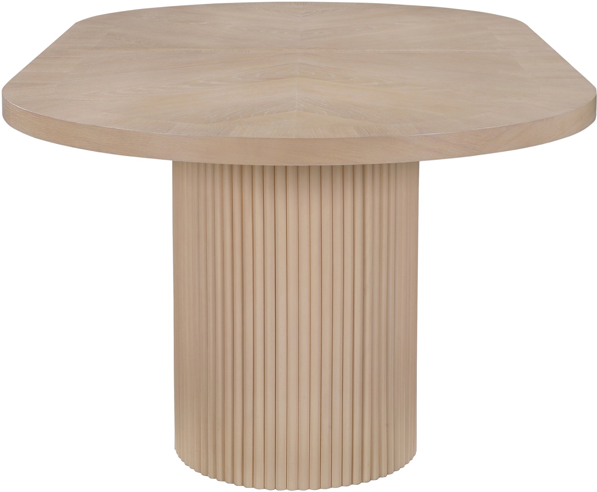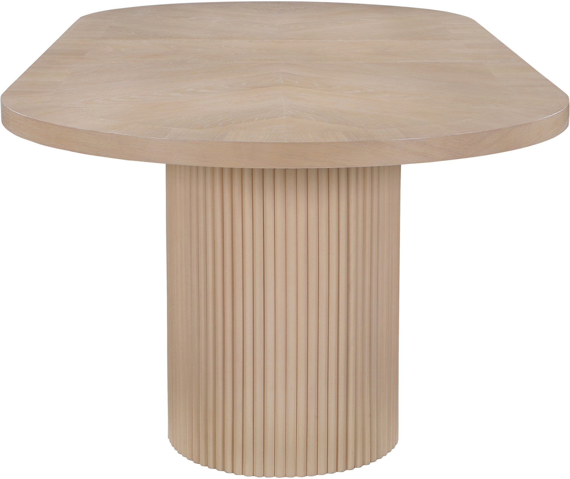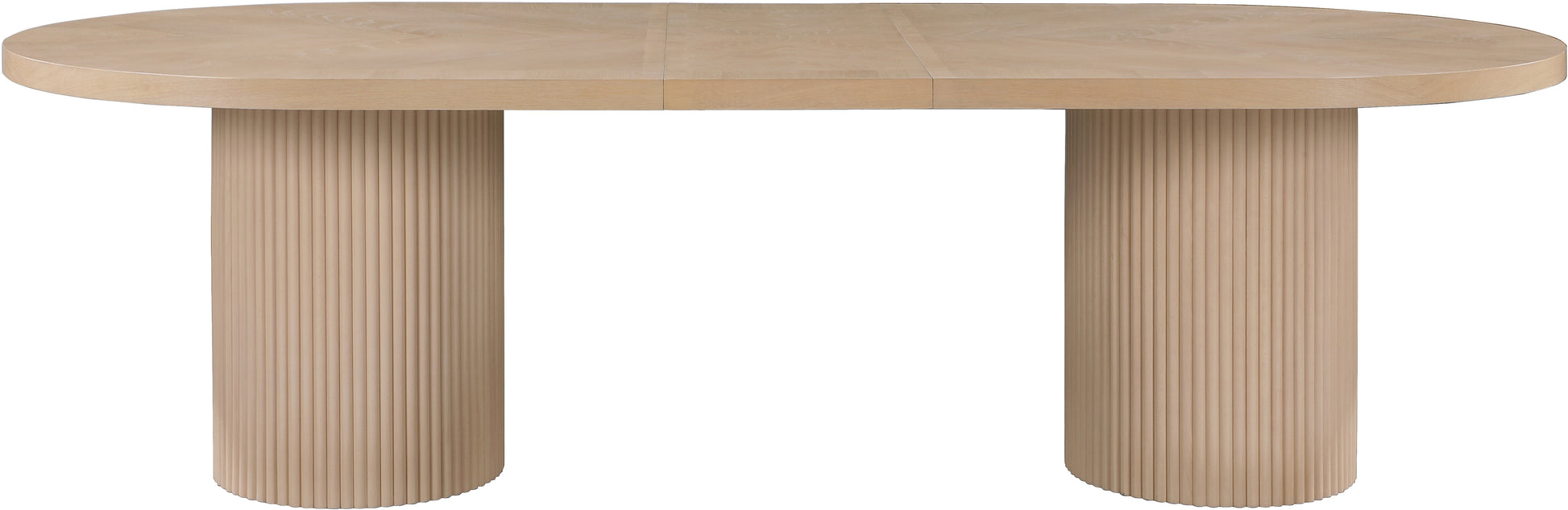 Transform your dining area with this elegant Belinda white oak wood dining table (3 boxes). Crafted from solid wood with a white oak veneer, this table is sure to last for generations. Its modern oval design is perfect for any contemporary dining space, while its fluted bases provide durability as well as make a unique fashion statement. Two leaves are included, so you can adjust the length of the table according to how many guests you're entertaining.