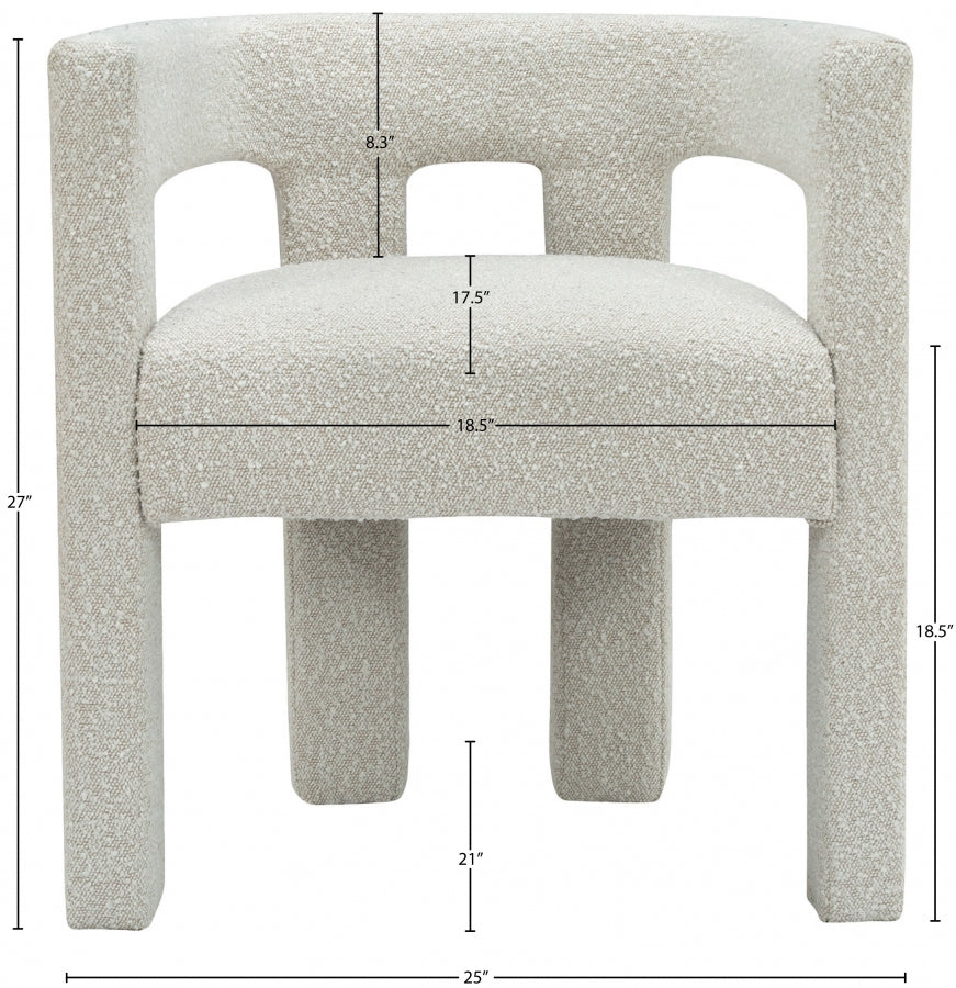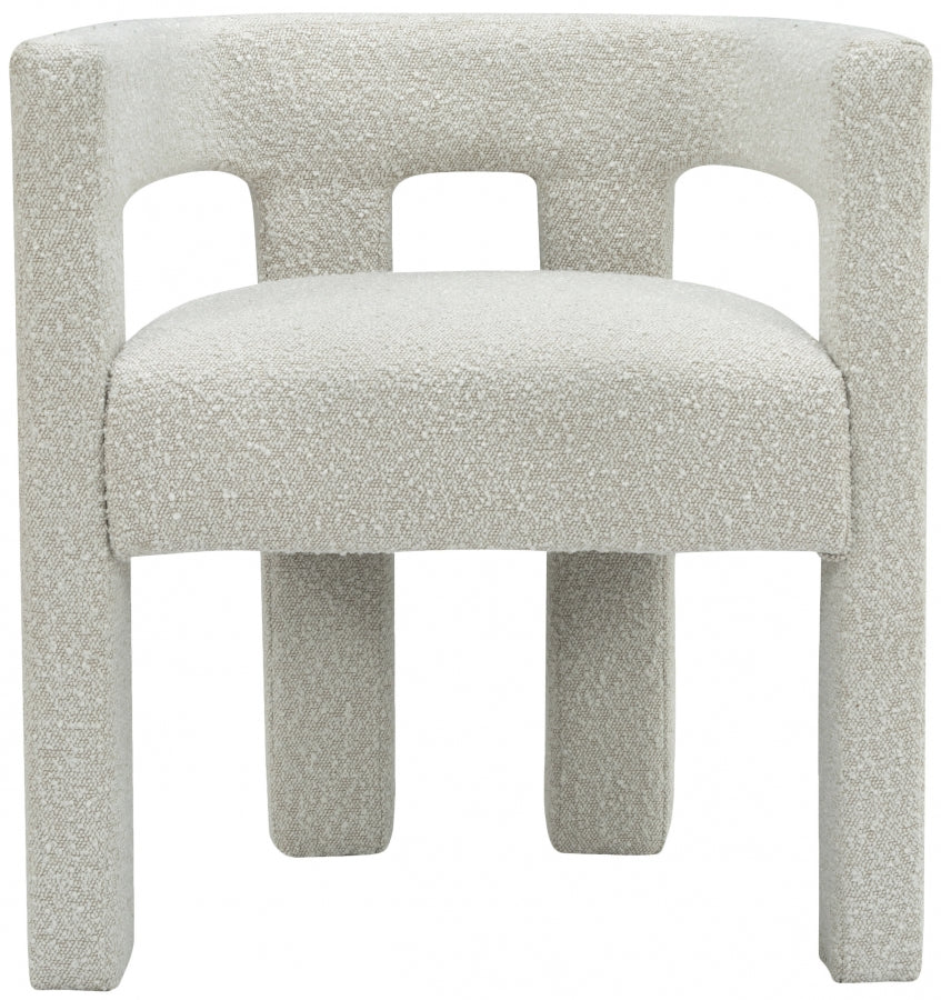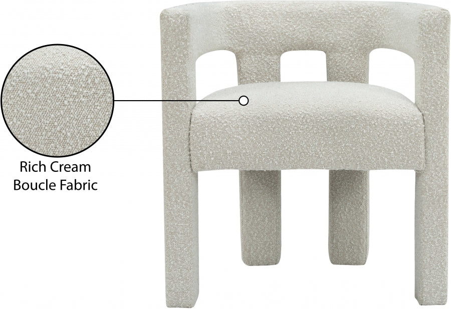Get comfortable with this Athena dining chair featuring minimalistic design elements and a simple footprint. Artfully designed, this dining chair is made for comfort with a rounded footprint that hugs your back while you sit and relax with friends. The chair is covered top to bottom in rich cream boucle fabric, so it's super soft to the touch and elegant to the eye.