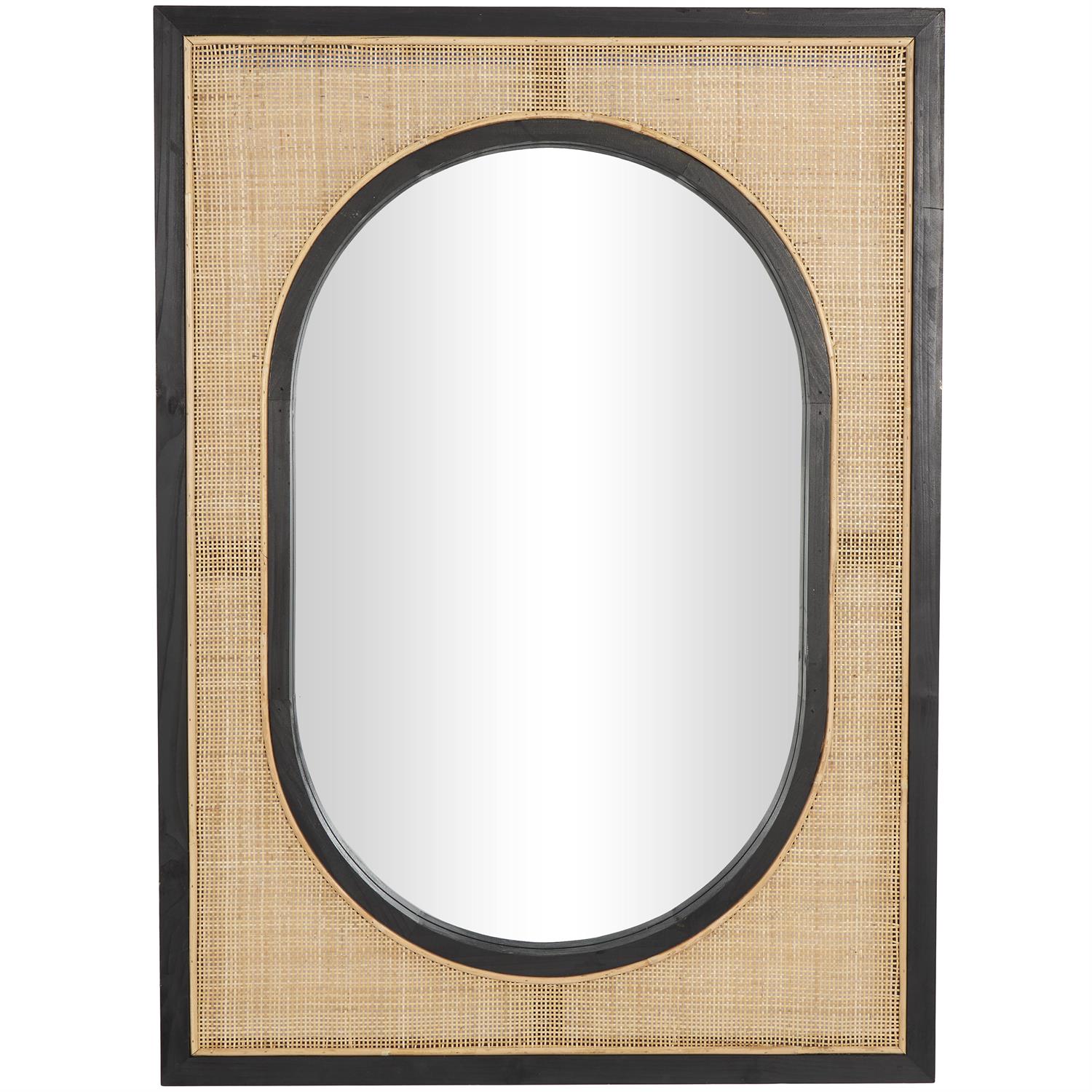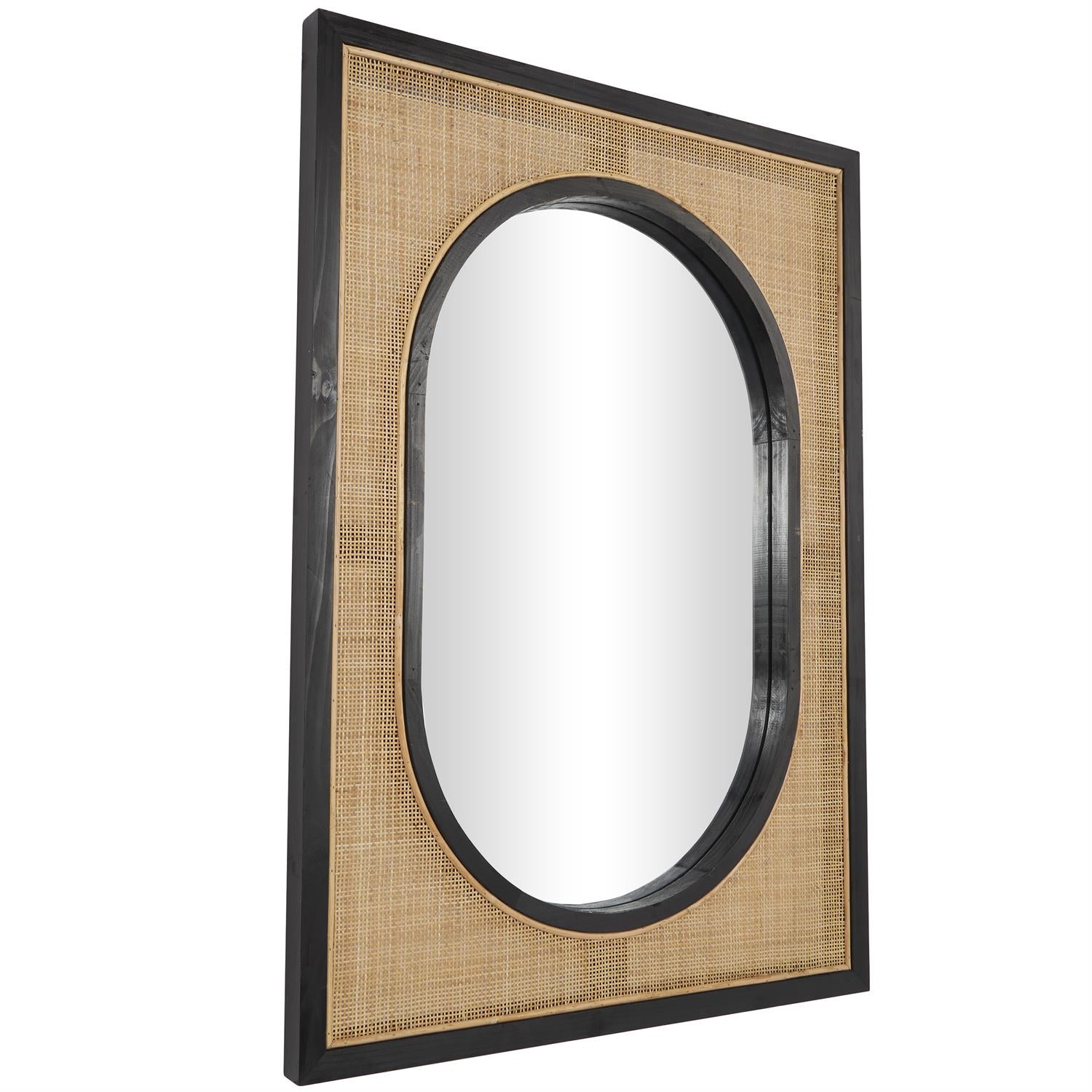 - The matte brown mirror for wall has an oval glass that rests inside a rectangle frame, with a grid-like rattan weave surrounding it