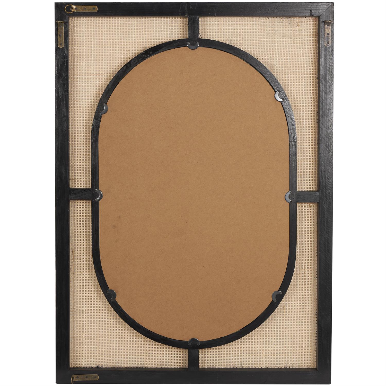 - The bohemian accent wall mirror features an oval-shaped mirror encased in black, with a rattan weave and MDF backing