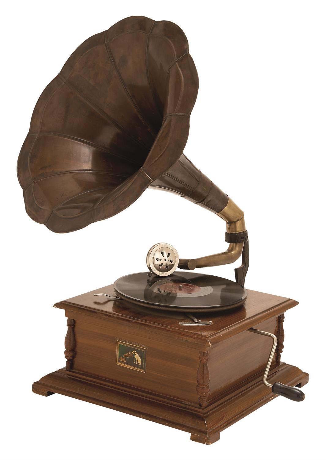 Gramophone decor highlights a metallic penny brown horn finish and caramel brown wooden box finish