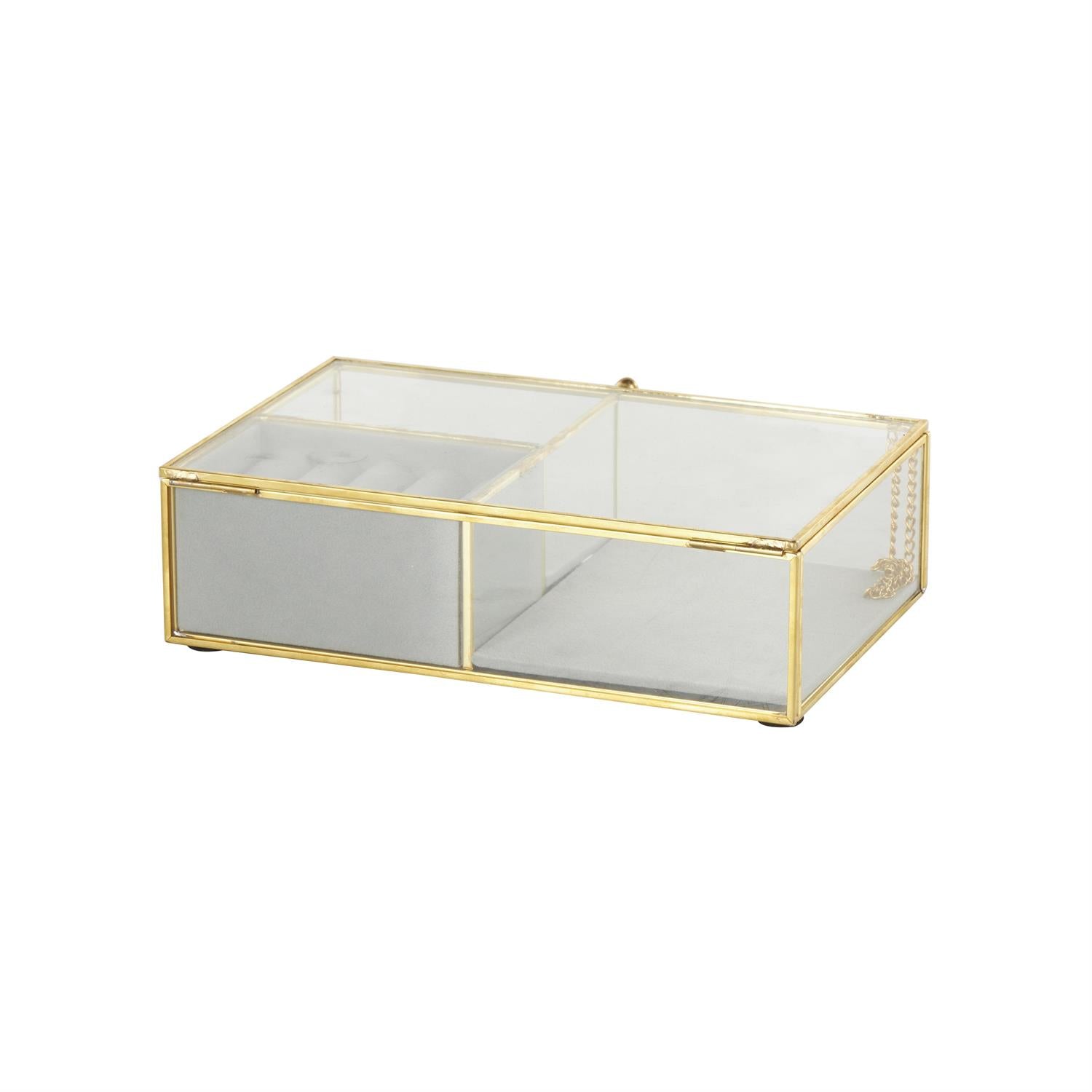 Rectangle jewelry case boasts a shiny clear glass exterior, complemented by an elegant gold metal frame and a sophisticated gray interior fabric