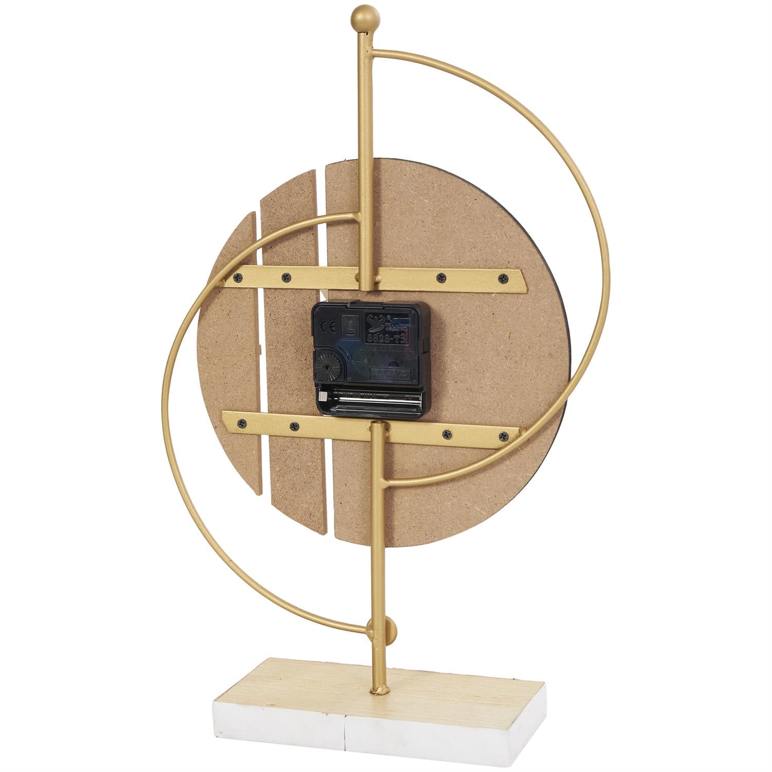The clock's notable features include wood accents and a gold semicircle frame that adds a touch of elegance and visual interest to the piece
