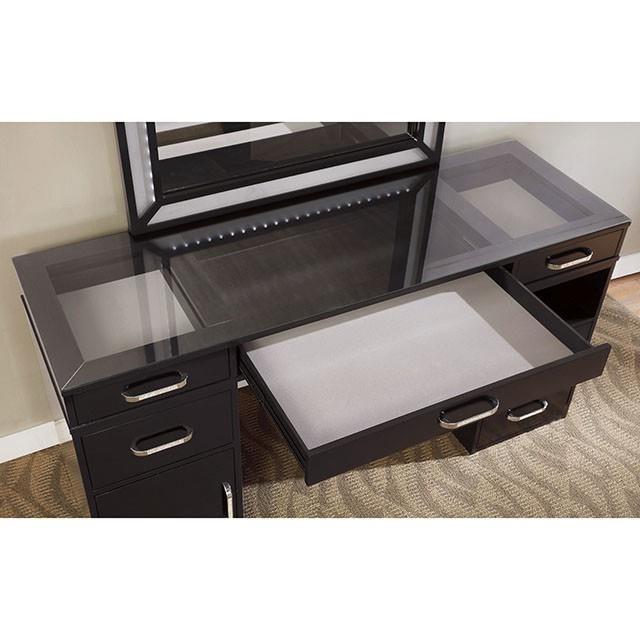 It's a gorgeous illuminated set. A beauty station that provides the right amount of space. With a multitude of drawers, the inclusion of a cabinet and open shelf make this an ideal setting for any preparing for a night on the town.