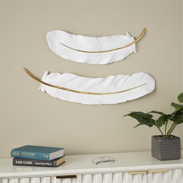 WHITE RESIN BIRD FEATHER WALL DECOR WITH GOLD FOIL ACCENT, SET OF 2 30", 23"W