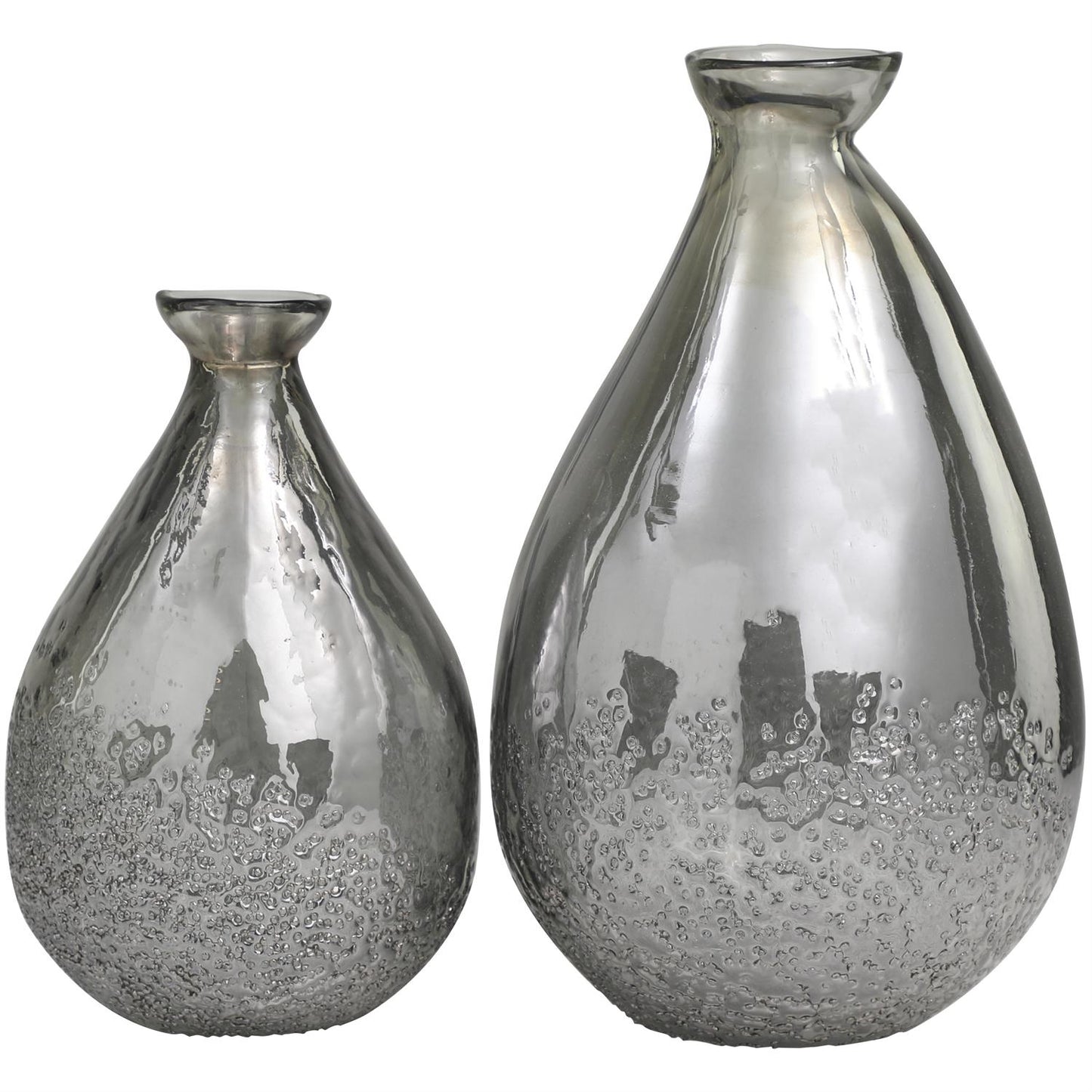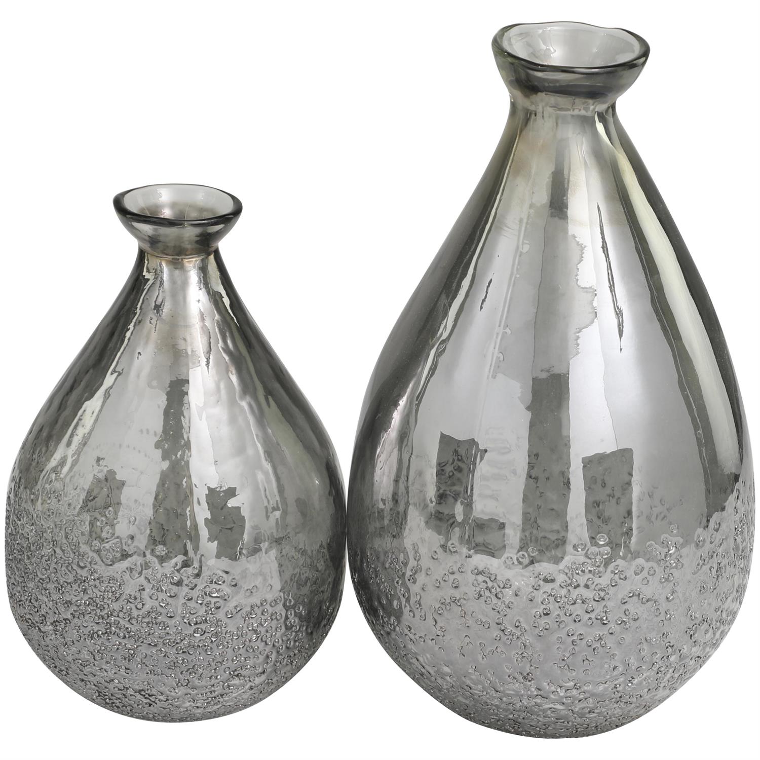 - The smoked gray vases for faux flowers have a teardrop form with a narrow neck and gradual bubble style texturing at the base