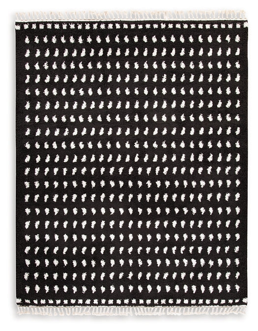 Sink your feet into this modern area rug. Offering a luxurious shag with woven dot design in black and white, this rug adds sophistication to any space without sacrificing comfort or durability. Finished with a braided tassel edge completing the design, this family friendly accent rug is easy to maintain.