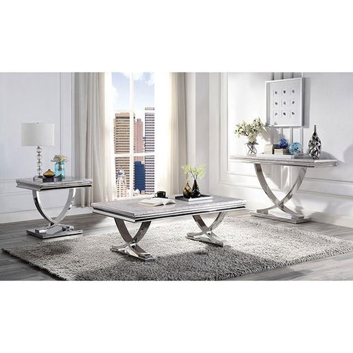 This coffee table is designed with luxury and exuberance in mind. It features a faux marble top with beveled edges, held up by curved pedestals finished in brilliant chrome. With the interlocking design resting upon a similarly sleek chrome base, it will complete any exquisite home decor.