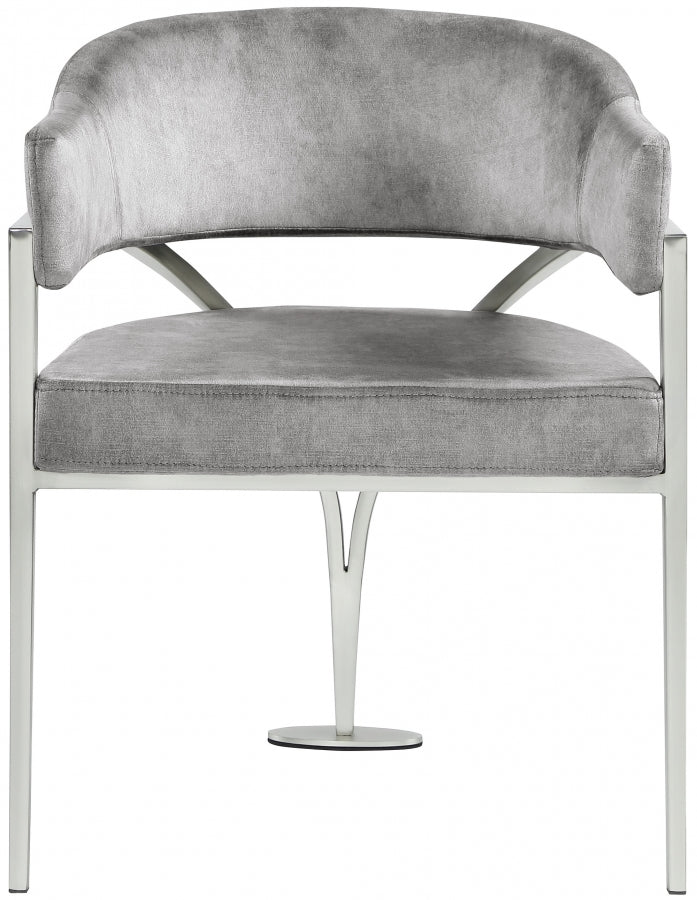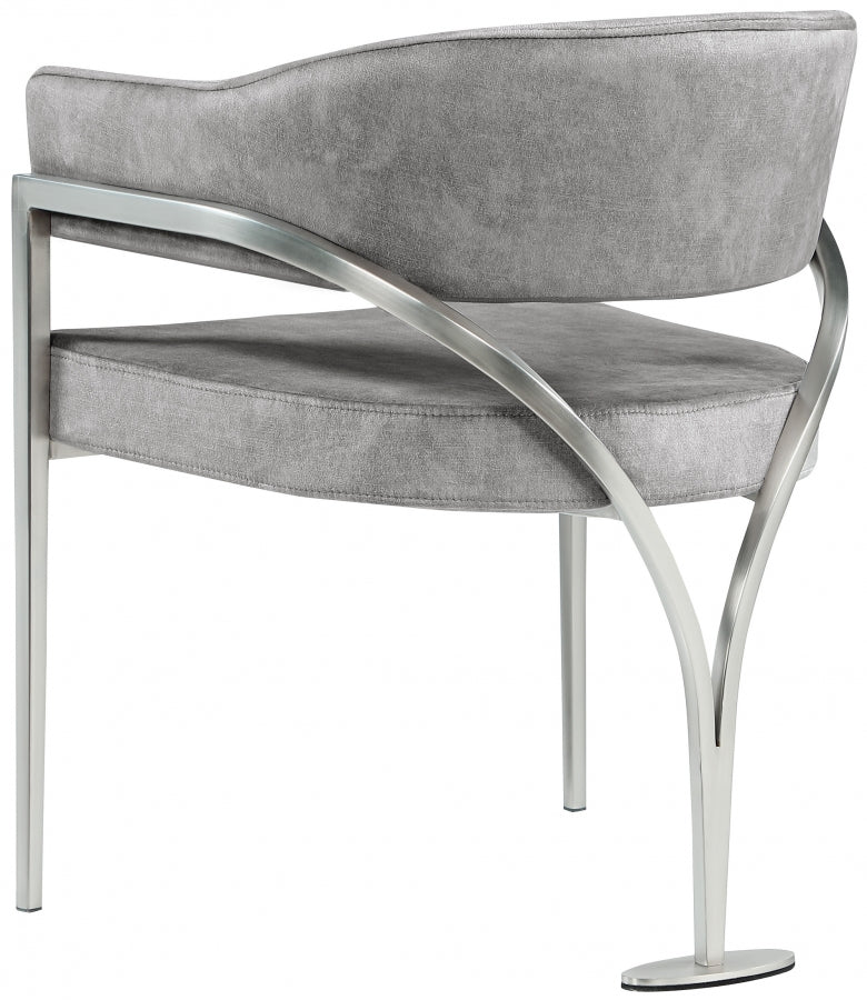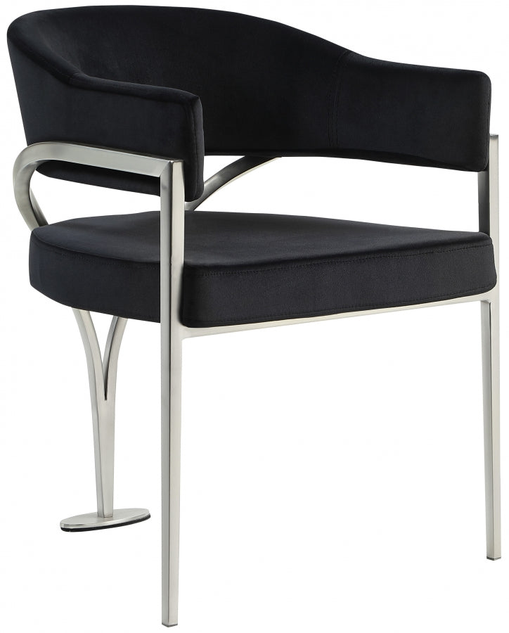 Give your dining area a show-stopping new look when you bring home one or more of these Madelyn velvet dining chairs. The Madelyn chair is all about comfort and style with its barrel-back design and its sophisticated lines. Upholstered in luxurious black velvet that's inviting to the skin and super soft to the touch, this chair features an iron metal frame for durability and lasting use in your busy home. The brushed chrome finish adds a final modish touch to this lovely dining chair.