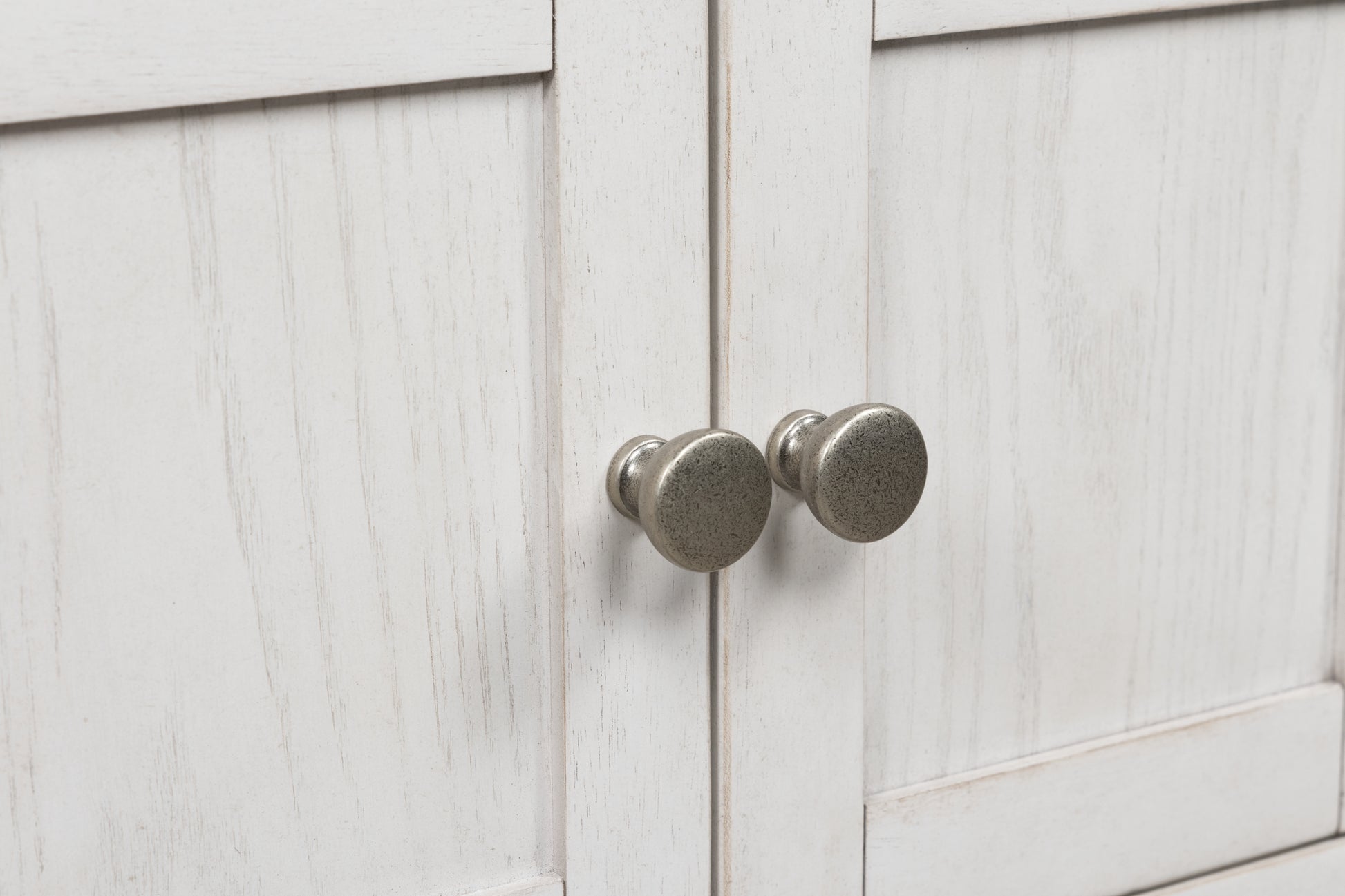 | Details | Includes dining table top and base, Made with rubberwood solids, ash veneer and MDF substrates, Antiqued white finish with wood grain texture, Two 10-bottle wine storage shelves (1 reversible), Lower door cabinet accessible from both sides, 2 pass-through drawer bins, Assembly required | |