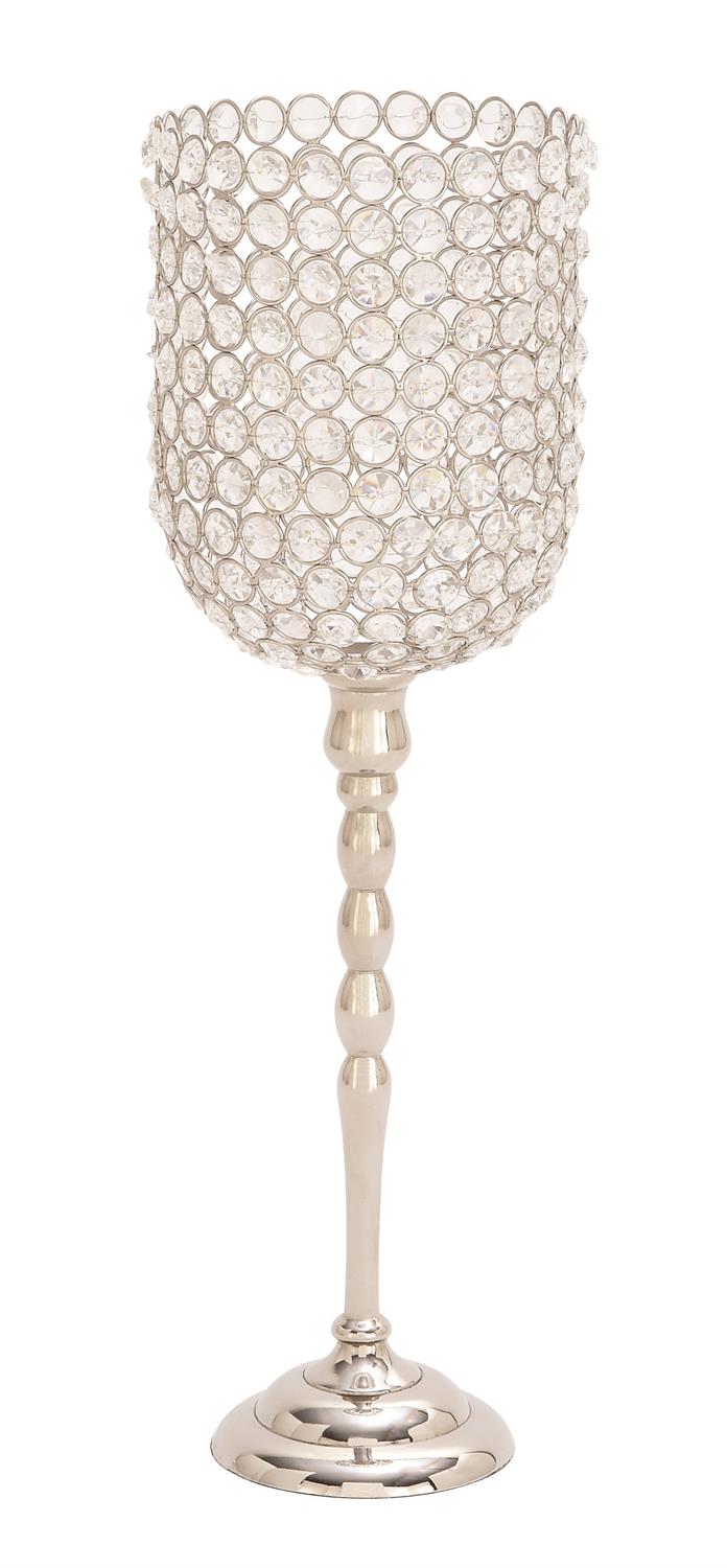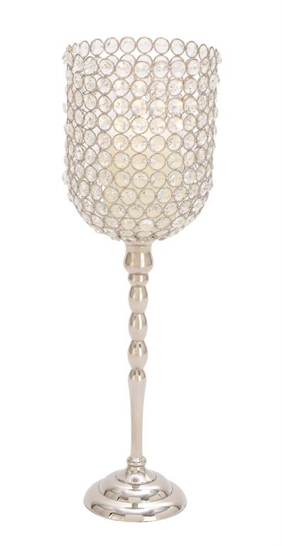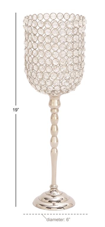 The silver aluminum metal hurricane lamp measures 6L x 6W x 19H inches, and weighs 3.08 lbs